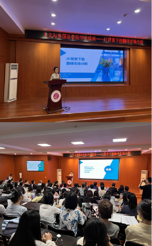翻译不仅仅是语言符号的转换,更是文化的桥梁和思想的传递。张卓校友以经验丰富的翻译从业者角度,对当今AI翻译市场影响下的翻译实践展开深刻探讨。她通过从业的实践经验总结了译者需要掌握的基本能力,就AI翻译与人工翻译优劣势、译者能力提升等方面进行全方位、多维度剖析。互动探讨环节中,同学们纷纷表示,面对AI市场下新的挑战,强化个人素质和综合能力是积极的应对之策。